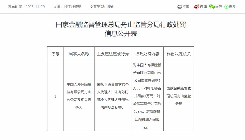 中国经济网北京11月20日电国家金融监管局舟山监管办今天公布的行政处罚信息公示表显示,中国首福保险股份有限公司舟山分公司及相关责任人委托了不合规个人代表。国家金融监督管理局舟山分局未能有效防范个人代理人的违法行为。国家金融监督管理局舟山分局对中国人寿保险股份有限公司舟山分公司给予警告,并处以2万元罚款。叶阳受到警告并罚款1万元。戴军受到警告并罚款1万元。并且潘毅被永久禁言ROM进军保险行业。原文如下。